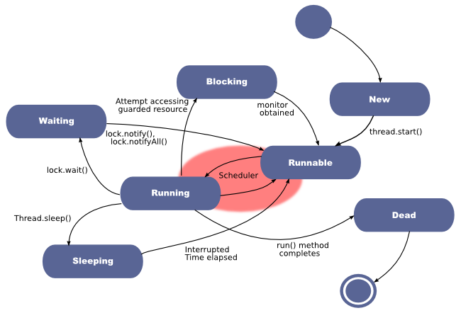 En cualquier caso, es muy importante conocer los estados en los que se pueden encontrar un hilo. Estos estados se suelen representar mediante un gráfico como el que sigue: