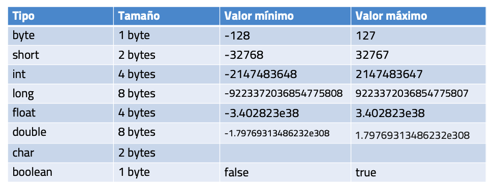 bytePermite almacenar números enteros (positivos y negativos) (8 bits)shortPermite almacenar números enteros (positivos y negativos) (16 bits)intPermite almacenar números enteros (positivos y negativos) (32 bits)longPermite almacenar números enteros (positivos y negativos) (64 bits)floatPermite almacenar números de coma flotantedoublePermite almacenar números de coma flotante de doble precisiónbooleanPermite almacenar valores booleanos (true/false)StringPermite almacenar cadenas de texto de longitud variable (cualquier caracter)charPermite almacenar un solo caracter