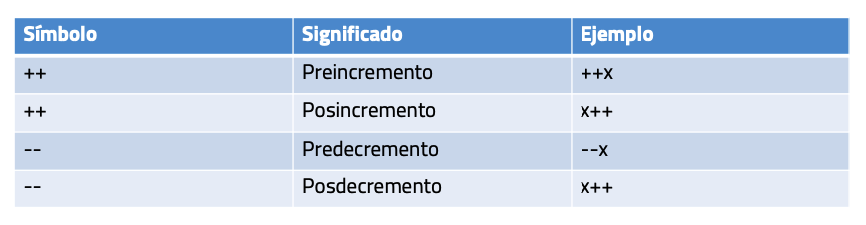 - -Al igual que ocurre con el anterior operador, puede ser utilizado como operador de predecremento posdecremento, dependiendo de si se coloca a la izquierda o derecha de la variable, respectivamente